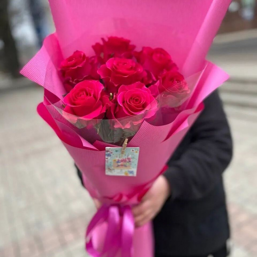 На фото букет из 7 малиновых роз. В составе: роза 7 шт, крафт-бумага 1 шт, атласная лента 1 шт, . Все цветы свежие и ароматные, букет красиво оформлен и отлично подходит для подарка. Доступна доставка цветов или самовывоз.