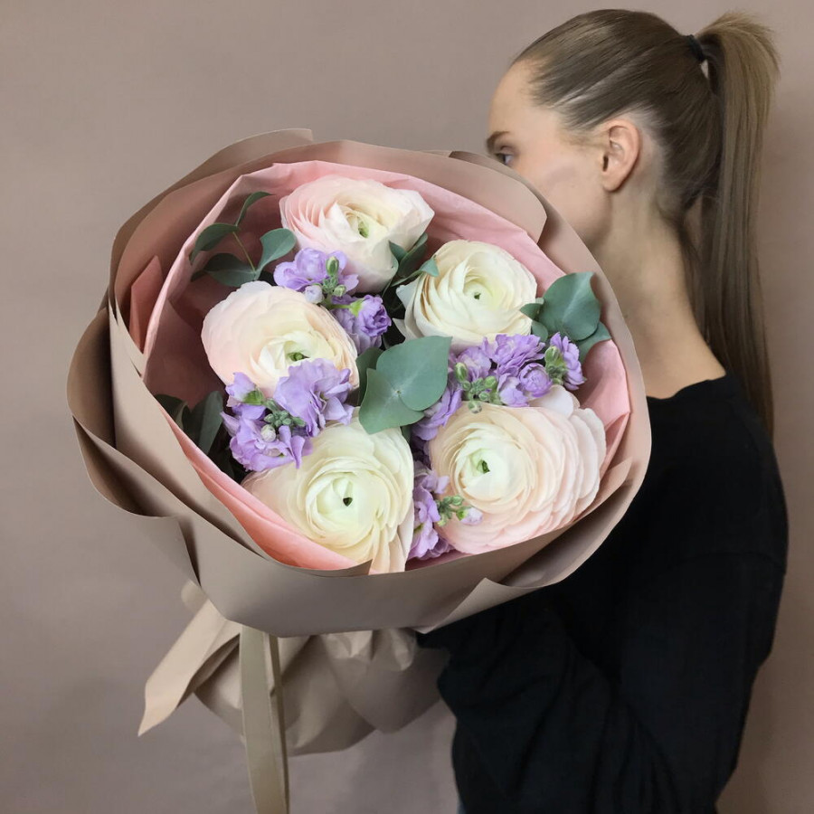 Букет из розовых ранункулюсов и сиреневой матиолы в Белой Калитве