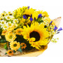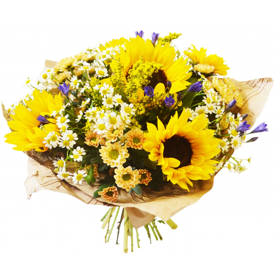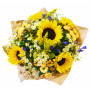 Яркие желтые, словно солнце, гелиантусы, кремовая хризантема сантини, мелкая ромашка и солидаго в ослепительном, по-летнему солнечном букете в любой пасмурный день создадут яркое радостное настроение и долго будут радовать получательницу своими броскими красками. Превратите будний день в праздник и подарите любимой этот эффектный букет.